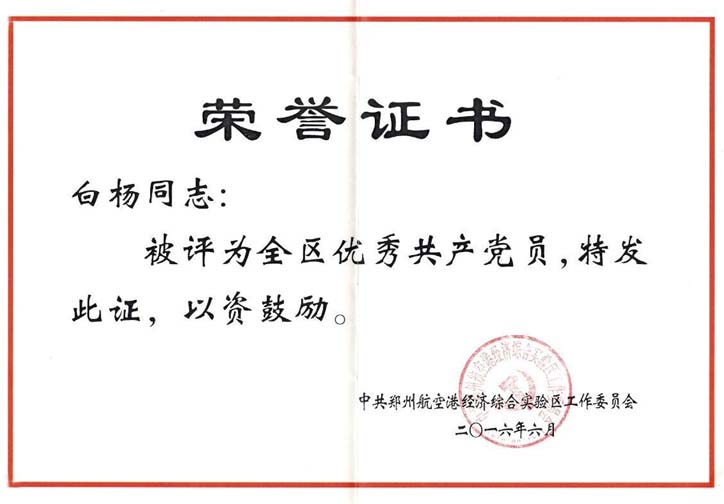 熱烈祝賀公司黨支部組織委員白楊獲得“鄭州市航空港經(jīng)濟綜合實驗區(qū)優(yōu)秀共產(chǎn)黨員”榮譽稱