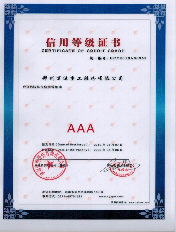 2019年5月7日,河南信用評(píng)估咨詢有限公司簽發(fā)AAA主體信用等級(jí)證書授予鄭州萬達(dá)重工股份有限公司。在2019年的AAA主體信用評(píng)級(jí)中,鄭州萬達(dá)重工股份有限公司順利通過復(fù)審,榮獲AAA信用等級(jí)證書,保持了連續(xù)多年的AAA信用等級(jí)。